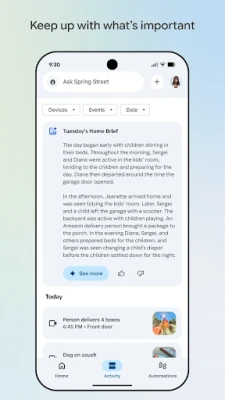 Визуализирайте случващото се пред и около дома си с несравнима яснота. Функцията за преглед на живо и подробна история на камерата в Google Home ви позволява безпроблемно да проследявате дейностите, които ви интересуват. А за едно наистина интелигентно изживяване, използвайте Gemini за Home. Просто изречете своите команди и желания, и наблюдавайте как устройствата ви се подчиняват, създавайки динамично и отзивчиво пространство, което се адаптира към вашите нужди.