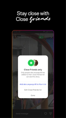 Изразете себе си по уникален начин и поддържайте връзка с приятели в движение. Споделяйте мимолетни истории и бележки, които изчезват след 24 часа, или започнете групови чатове, за да обменяте откровени моменти с вашите близки приятели. Споделяйте спомени от скорошни събития или пътувания във вашия основен поток, превърнете живота си във филм с кратки, завладяващи видеа в Reels и персонализирайте всяка публикация с ексклузивни шаблони, музика, стикери и филтри, които отразяват вашия личен стил.