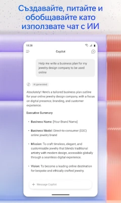 Представете си свят, в който сложните задачи се решават с лекота, а продуктивността ви достига нови висоти. **Microsoft 365 Copilot** преобразява начина, по който работите и творите, като поставя силата на изкуствения интелект директно във вашите ръце. Той е вашият интелигентен асистент, готов да обработва информация, да генерира идеи и да ви подкрепя във всяка стъпка от деня. С едно обикновено запитване на естествен език или дори чрез гласова команда, той може да обобщи дълъг документ, съхранен в облака или на телефона ви, да състави имейл, или да анализира данни от електронна таблица, освобождавайки ви време за най-важното.