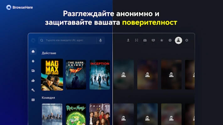 ТВ браузър BrowseHere предлага усъвършенствано уеб сърфиране за Android TV. Насладете се на филми, предавания и видеоклипове без реклами с вградения блокер. Бързо и лесно управление с дистанционното, плюс удобни отметки и история на сърфирането.