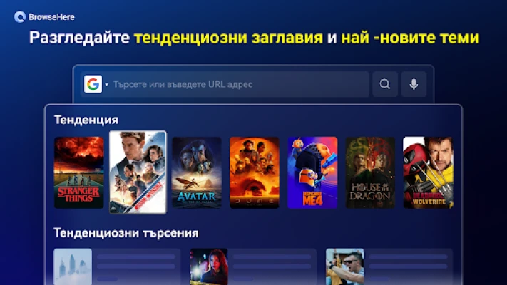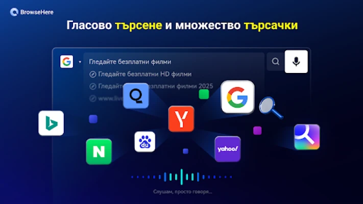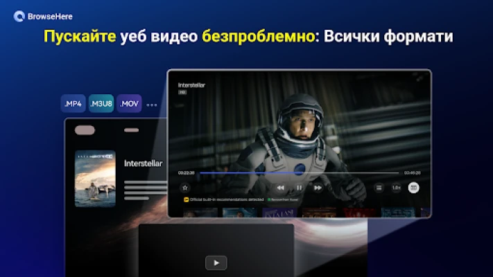 С BrowseHere вашите филми и предавания оживяват на големия екран. Нашият уеб видео плейър осигурява превъзходно гледане с опции за показалци и субтитри, лесно управляеми с дистанционното. Ако сте фен на телевизията на живо, интегрираният плейер ви дава достъп до каналите на вашия IPTV доставчик (моля, имайте предвид, че BrowseHere не предоставя източници на съдържание, а е платформа за възпроизвеждане на вашето). Забравете за досадното писане – търсете съдържание с гласа си на всеки език, а за да не пропуснете нищо, открийте подбрани безплатни филми и аниме директно на началната страница. Получавайте и интелигентни препоръки, съобразени с вашите предпочитания, които ще обогатят избора ви за гледане.