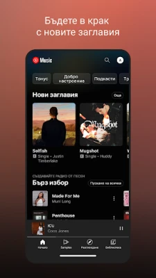 YouTube Music обогатява слушането ви с иновативни функции и гъвкавост. Следете световните тенденции с актуални класации и откривайте нови артисти и жанрове чрез специализирани миксове като „Нов микс" и „Микс от нова музика". Изпейте любимите си песни дума по дума с вградените текстове и превключвайте безпроблемно между аудио и видео версиите на съдържанието. Достъпвайте YouTube Music на всяко устройство – от телефон и настолен компютър до смарт високоговорител, телевизор или автомобил, и се интегрирайте с приложения като Google Карти и Waze за безупречно изживяване. За ненадминато слушане, YouTube Music Premium предлага възпроизвеждане без реклами, слушане във фонов режим и достъп до изтеглената ви музика, включително интелигентни изтегляния, за да сте винаги с любимите си мелодии, дори офлайн.