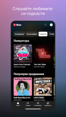 YouTube Music е вашата порта към безкраен музикален свят, където всяка нота е на една ръка разстояние. Открийте уникално съдържание, което не ще срещнете другаде – завладяващи изпълнения на живо, креативни кавъри, иновативни ремикси и музикални записи, ексклузивни за платформата. Потопете се в хиляди внимателно подбрани плейлисти, обхващащи безброй жанрове – от пулсиращ хип-хоп до успокояващ джаз, от енергичен поп до класически рок, идеални за всяка дейност или настроение през деня.