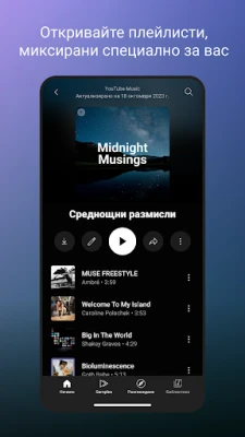 Насладете се на изцяло персонализирано музикално изживяване, създадено специално за вас. YouTube Music интелигентно генерира персонализирани миксове и плейлисти, отразяващи вашия уникален вкус и предпочитания. Независимо дали търсите ритъм за тренировка, мелодия за релаксация или фон за концентрация, ще откриете идеалния си музикален спътник. Създавайте собствени колекции с помощта на интелигентни предложения или си сътрудничете с приятели, за да изградите съвършения плейлист. Вашата лична фонотека съхранява всички харесани песни, албуми и изпълнители, осигурявайки лесен достъп до любимото ви съдържание по всяко време.
